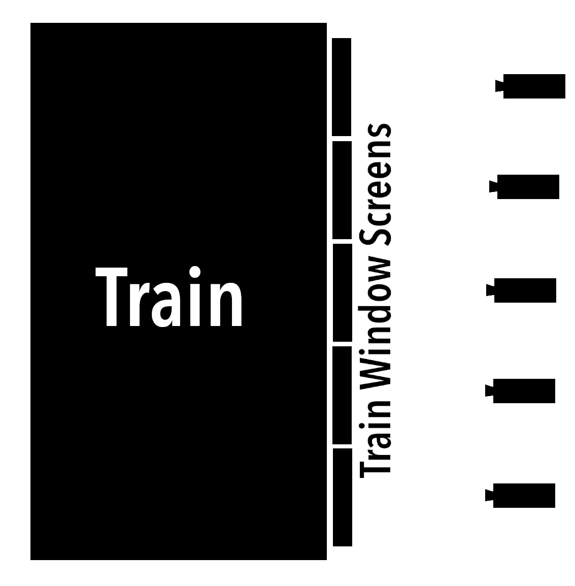 Modern trains / buses with an open-plan layout require several screens to effectively cover all of the windows of the carriage (precise number depending on exact composition of shot).