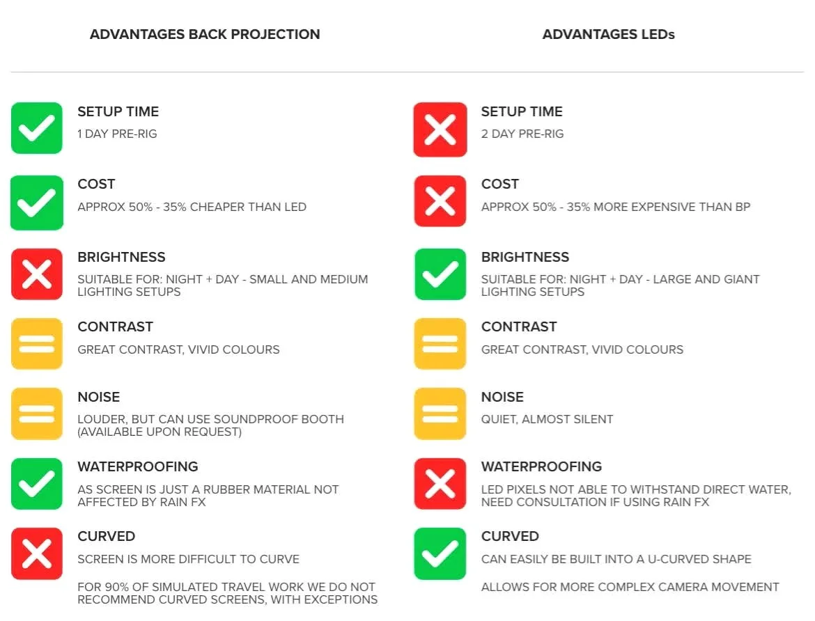 The devil is in the details - that is why we combine the LED image together with separate secondary screens designed to appear in reflective surfaces (eg. windscreen) and our innovative reactive lighting system - synchronised with the background image, aimed at completely immersing the scene into reality. The level of control and realism this gives us is all intended to give you the best visuals and flexibility.